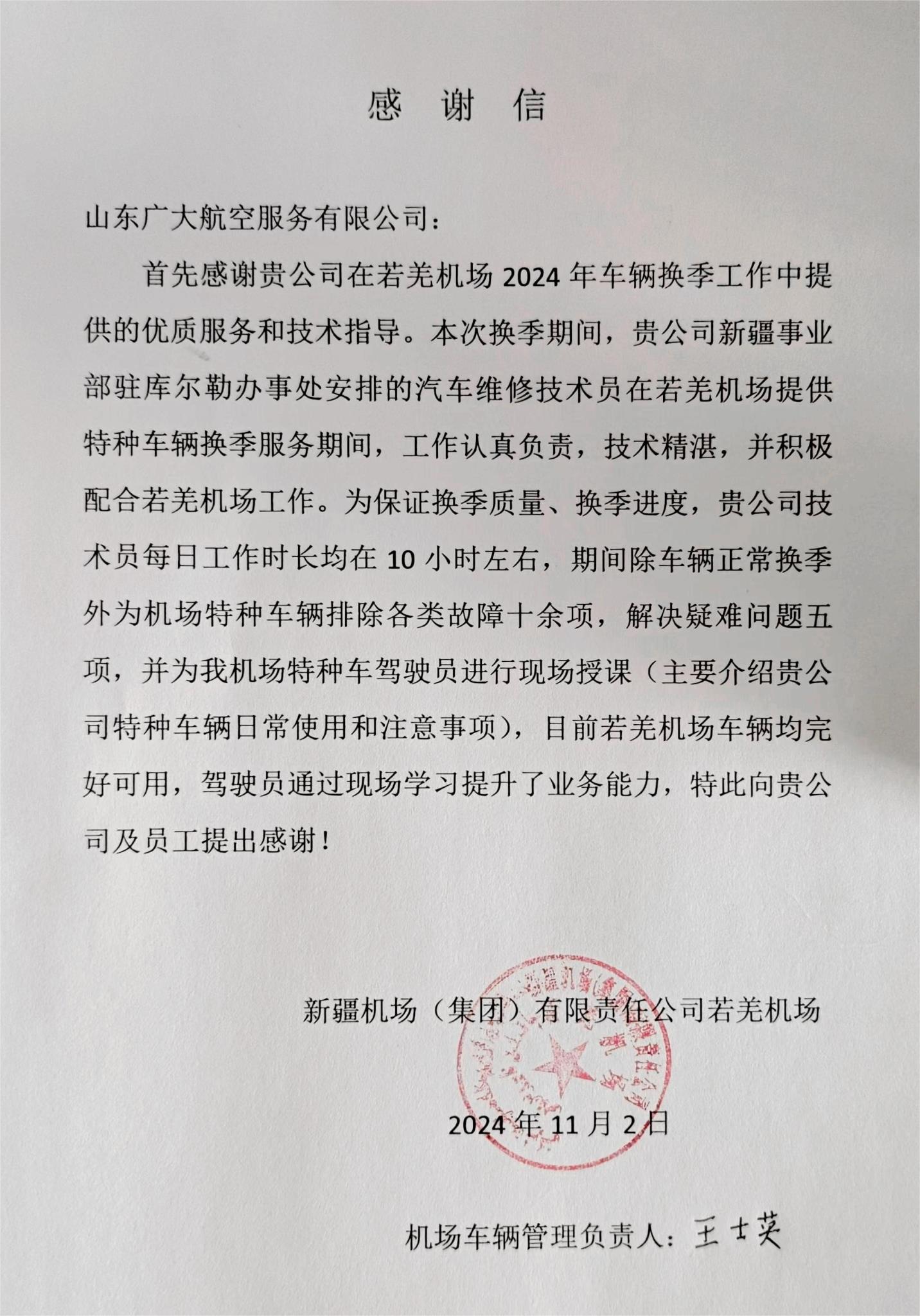 近日,新疆機場(集團)有限責(zé)任公司若羌機場向山東廣大航空服務(wù)有限公司(以下簡稱“廣大航服”)致感謝信,對其在2024年車輛換季工作中提供的優(yōu)質(zhì)服務(wù)和技術(shù)指導(dǎo)表示誠摯的感謝。若羌機場在感謝信中提到,廣大航服的汽車維修技術(shù)員在換季期間表現(xiàn)出色,以專業(yè)技能和敬業(yè)精神為若羌…