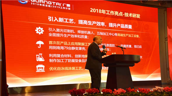 1月19日,“廣泰集團2018年度工作總結暨表彰大會”于集團研發大樓三樓會議廳召開,廣泰集團董事長李光太、副董事長郭少平、集團總經理李文軒及廣泰集團各中心、各事業部的領導干部和股份公司獲表彰員工共計500余人參會。廣泰集團生產一廠、生產二廠、羊亭特車、中卓時代、山鷹報警、…