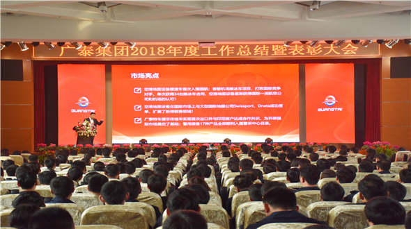 1月19日,“廣泰集團2018年度工作總結暨表彰大會”于集團研發大樓三樓會議廳召開,廣泰集團董事長李光太、副董事長郭少平、集團總經理李文軒及廣泰集團各中心、各事業部的領導干部和股份公司獲表彰員工共計500余人參會。廣泰集團生產一廠、生產二廠、羊亭特車、中卓時代、山鷹報警、全華時代、員工通過分會場視頻同步收看集團大會。2018年是改革開放40周年,也是廣泰集團化的元年。這一年,廣泰集團緊跟國家政策,全體員工充分發揚匠心專注、執著追求的精神,攻堅克難、不畏艱辛,各主要業務板塊超額完成任務,主要經濟指標保持中高速增長,因此本次大會是廣泰集團總結經驗、繼往開來的交流會,也是表彰先進、學習典型的盛典。