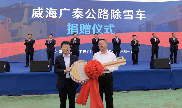 2021年6月威海廣泰高端應急救援保障裝備制造基地奠基儀式捐贈臨港區政府兩臺高端公路除雪車